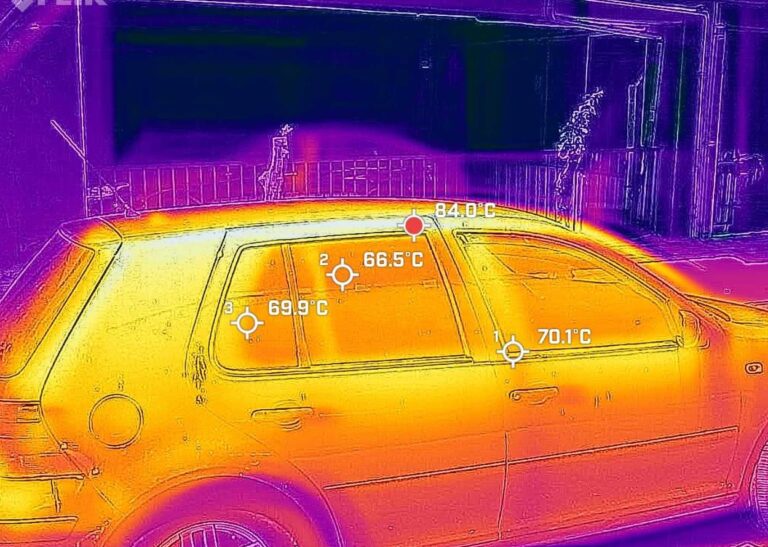 Το αμάξι που έχει «πιάσει» η θερμική κάμερα ξεχωρίζει και φαίνεται σαν να φλέγεται. Αν αναλογιστεί κανείς, ότι η θερμοκρασία φαίνεται να έχει φτάσει τους 84 βαθμούς Κελσίου στην οροφή του και στους 70,1 βαθμούς στα πλαϊνά.